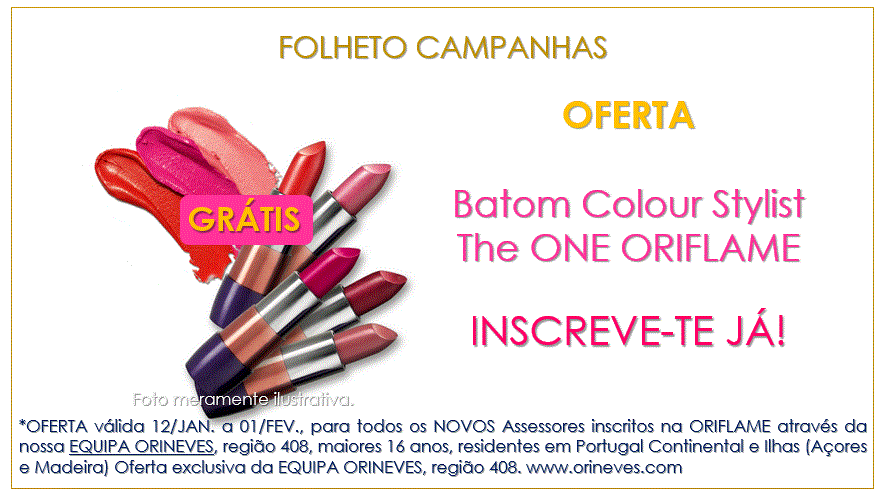 INSCREVE-TE na ORIFLAME através da nossa EQUIPA ORINEVES de 12/Janeiro a 01/Fevereiro, valida a tua inscrição com uma encomenda (qualquer valor) e recebe de OFERTA um Batom Colour Stylist The ONE ORIFLAME.